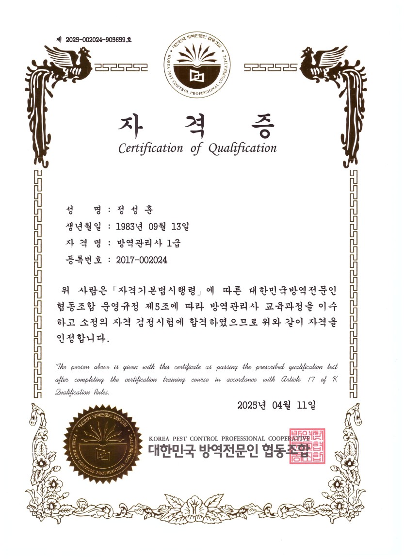 방역관리사 1급 자격증(취득완료)